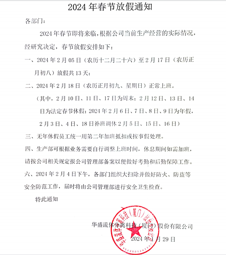 2024年春节即将来临,根据公司当前生产经营的实际情况,经研究决定,春节放假安排如下: