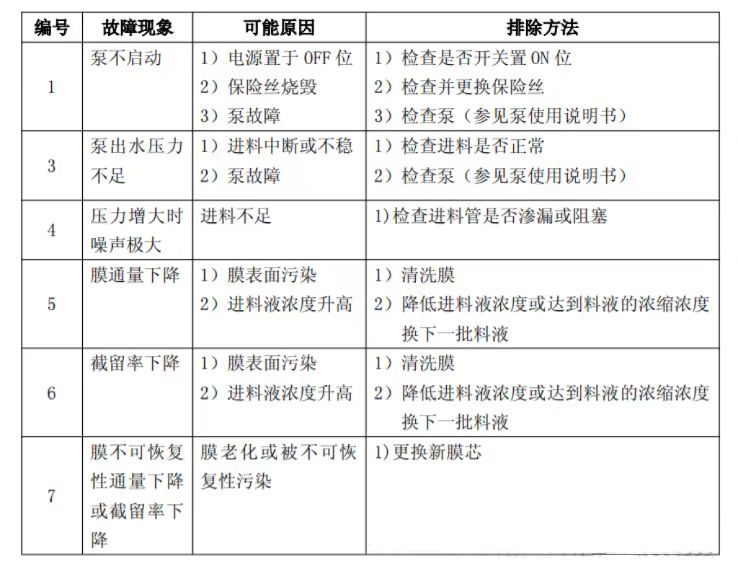 3)冲干净清洗剂后,往料桶中加入一定量的去离子水,使水温控制到 25℃,调节调压阀门使进/出口压力控制一定的压力,测膜的水通量,并记录下水温、进/ 出口压力和虑速;与走料前的水通量做对比,判断清洗效果。如恢复程度不够,需继续清洗 。